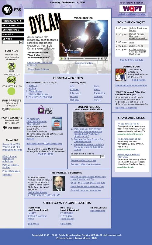 As it is in many organizations, the home page at PBS was a political hotcake. But in the peculiar public media environment of the United States, the greatest impediments to progress were cultural and the PBS.org Web site design remained unchanged for years as a result.