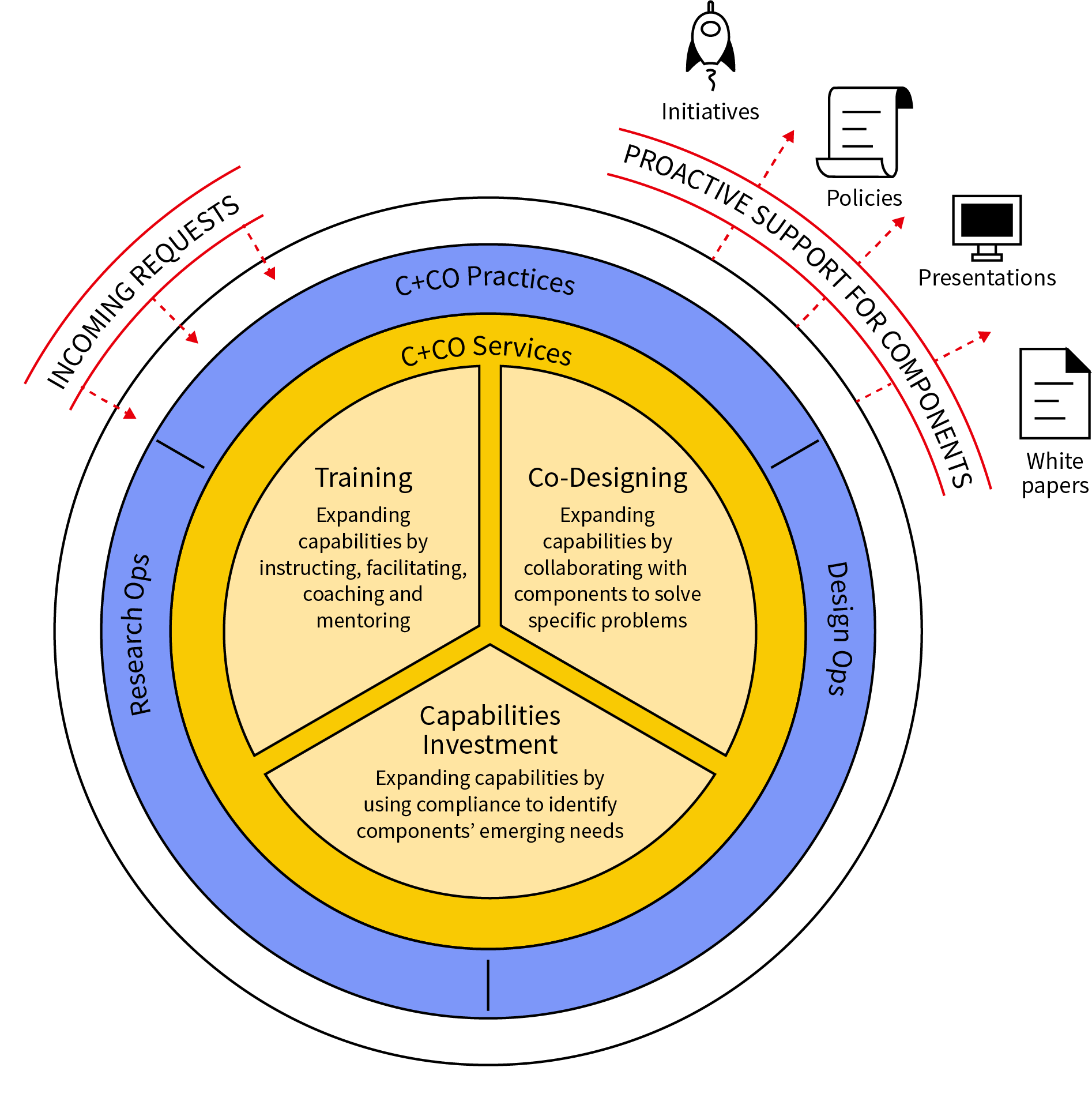 Analysis: Once I had what felt like a critical mass of information, I looked for emerging themes and started playing around with the idea of an operating model for the work of C+CO. (What I really wanted to do was to collaborate with the directors and branch chiefs to come up with a CXD operating model, but as a new person stepping into a contentious environment, I didn’t see a path where that would have been successful.)