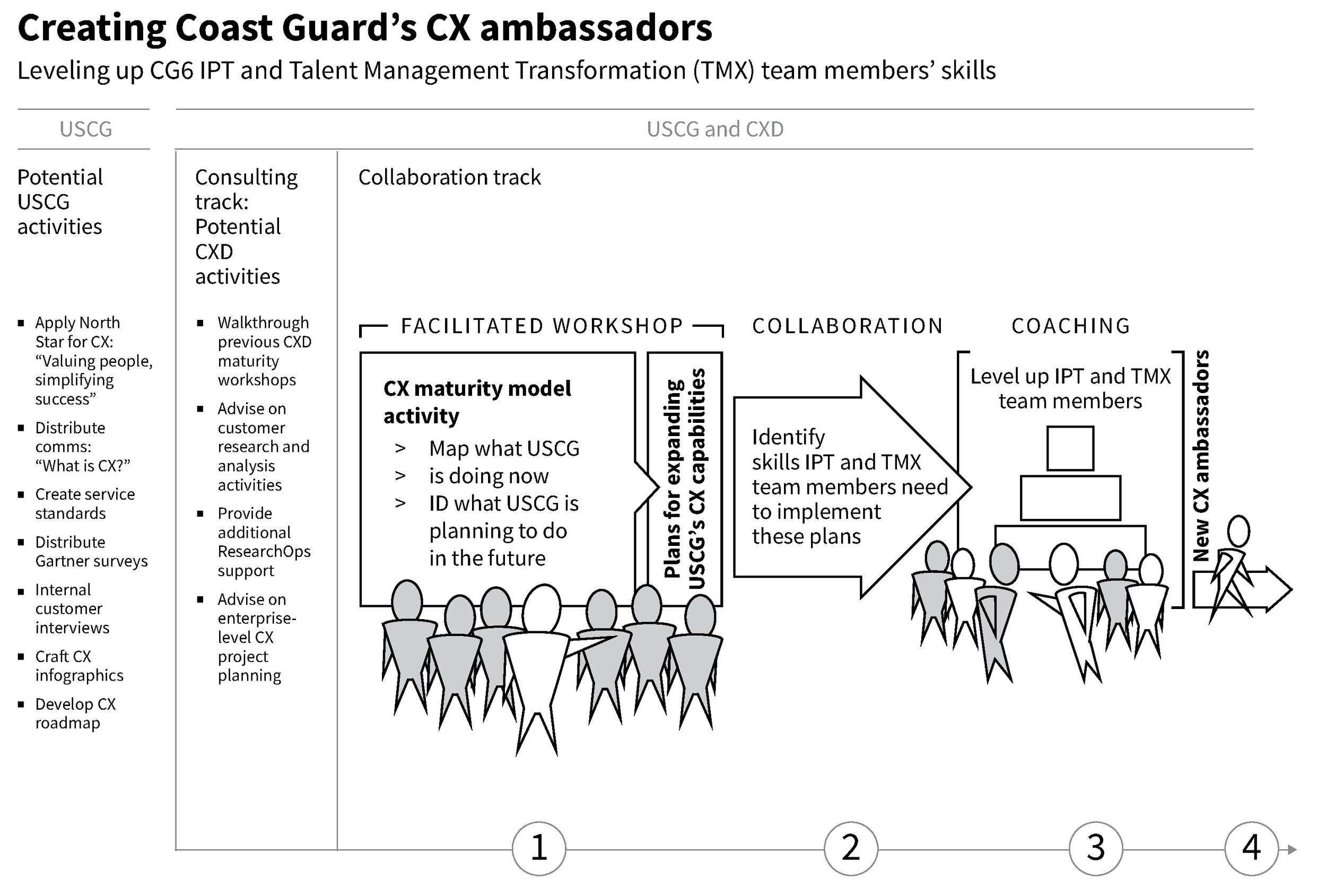 I facilitated a series of discussions where we developed a three-part process with my team of CX professionals to help the Coast Guard team expand its capabilities: